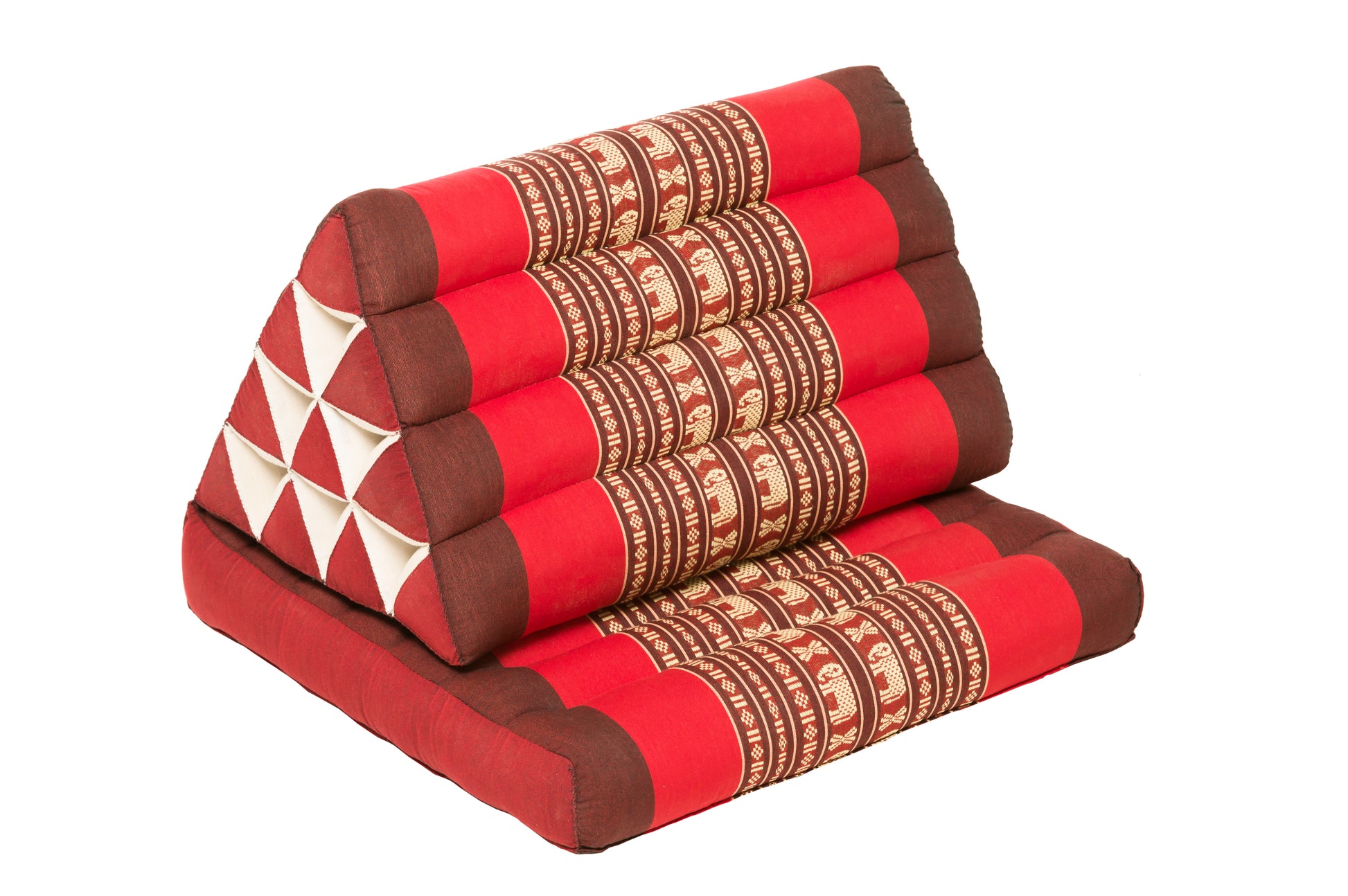 Dreieckskissen mit Matte in 78 x 50cm. Das Thaikissen ist 1-fach faltbar und mit Kapok gefüllt. Wunderschönes traditionelles Thaimuster in Elefanten rot. eine bequeme Sitzgelegenheit zum Meditieren, Lesen, Entspannen, Fernsehen etc. Durch die Kapokfüllung ist das Sitzkissen sehr atmungsaktiv und formstabil. Kapok wird aus den Früchten des Kapokbaums gewonnen und ist eine sehr leichte natürliche Hohlfaser, die wärme- und feuchtigkeitsausgleichend wirkt und so ein sehr angenehmes Sitzgefühl ermöglicht.