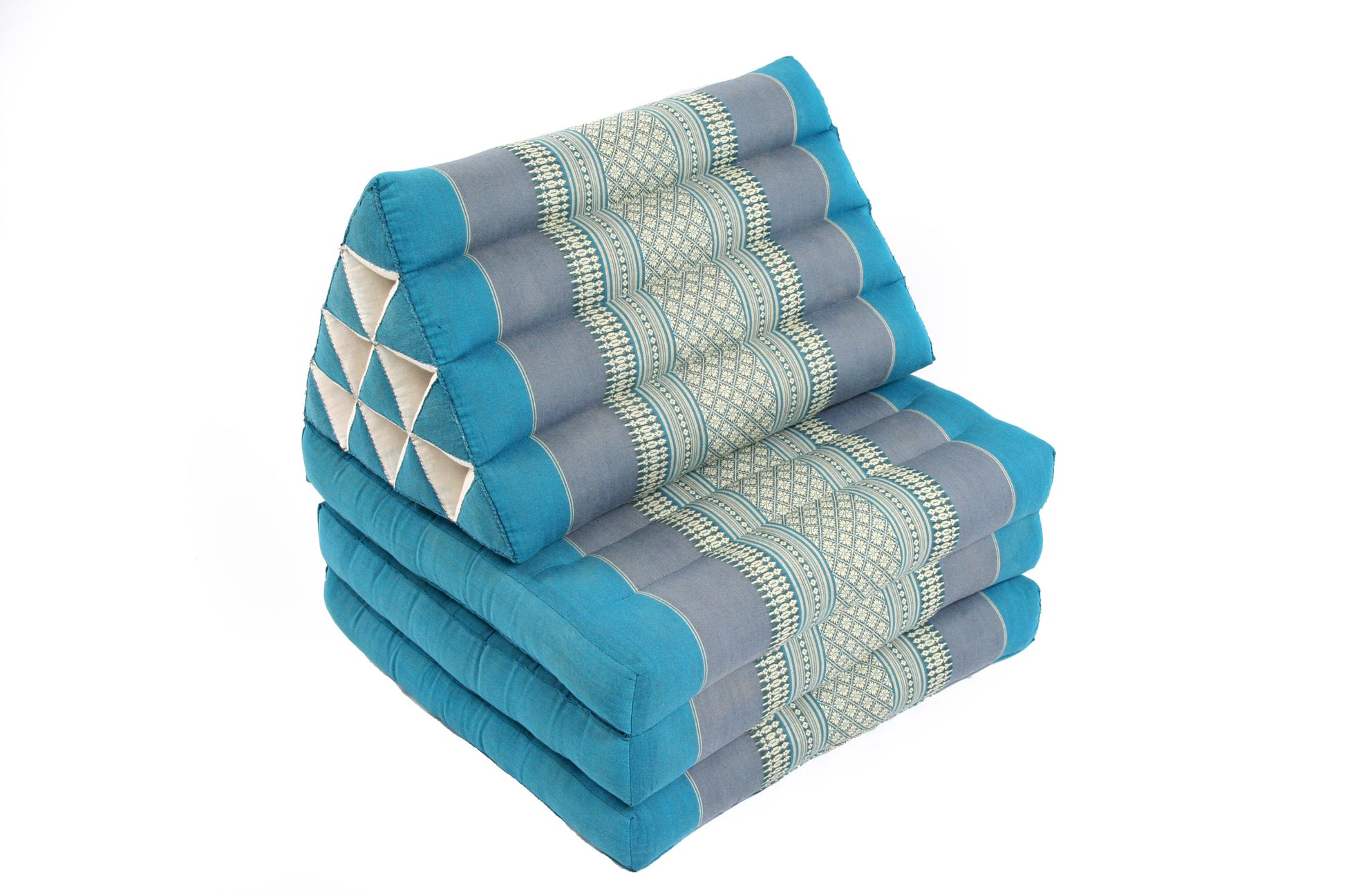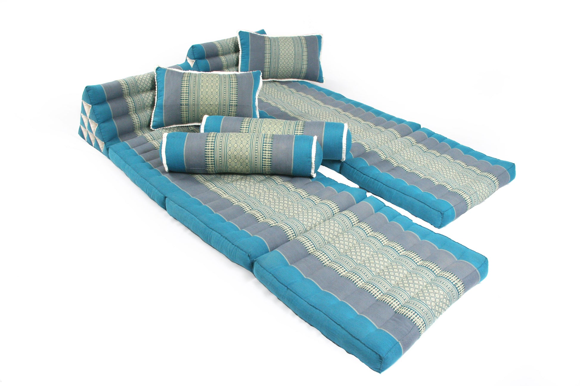 Zu diesem Thaikissen Set gehören 2 Dreiecksmatten in der Größe 170x50. Dazu liefern wir 2 Nackenrollen und 2 Sofakissen. So lässt sich mit den Kissen der perfekte Platz zum liegen, spielen oder chillen bauen.