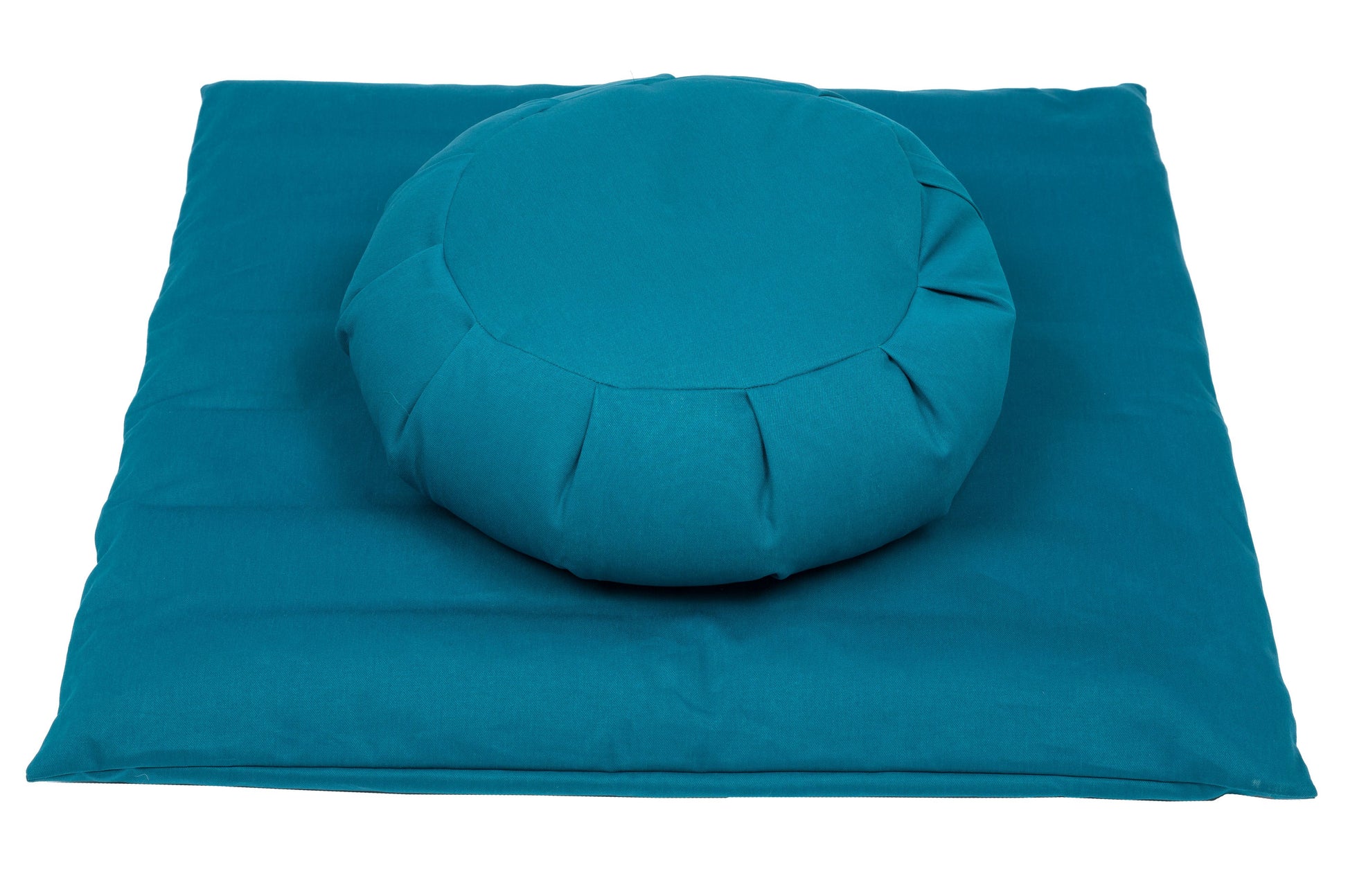 Meditationsset der Luxusklasse mit Zafu (mit praktischer Trageschlaufe) und Zabuton. Sowohl das Zafu, als auch die Zabuton sind mit 100% natürlichem Buchweizenspelz gefüllt.