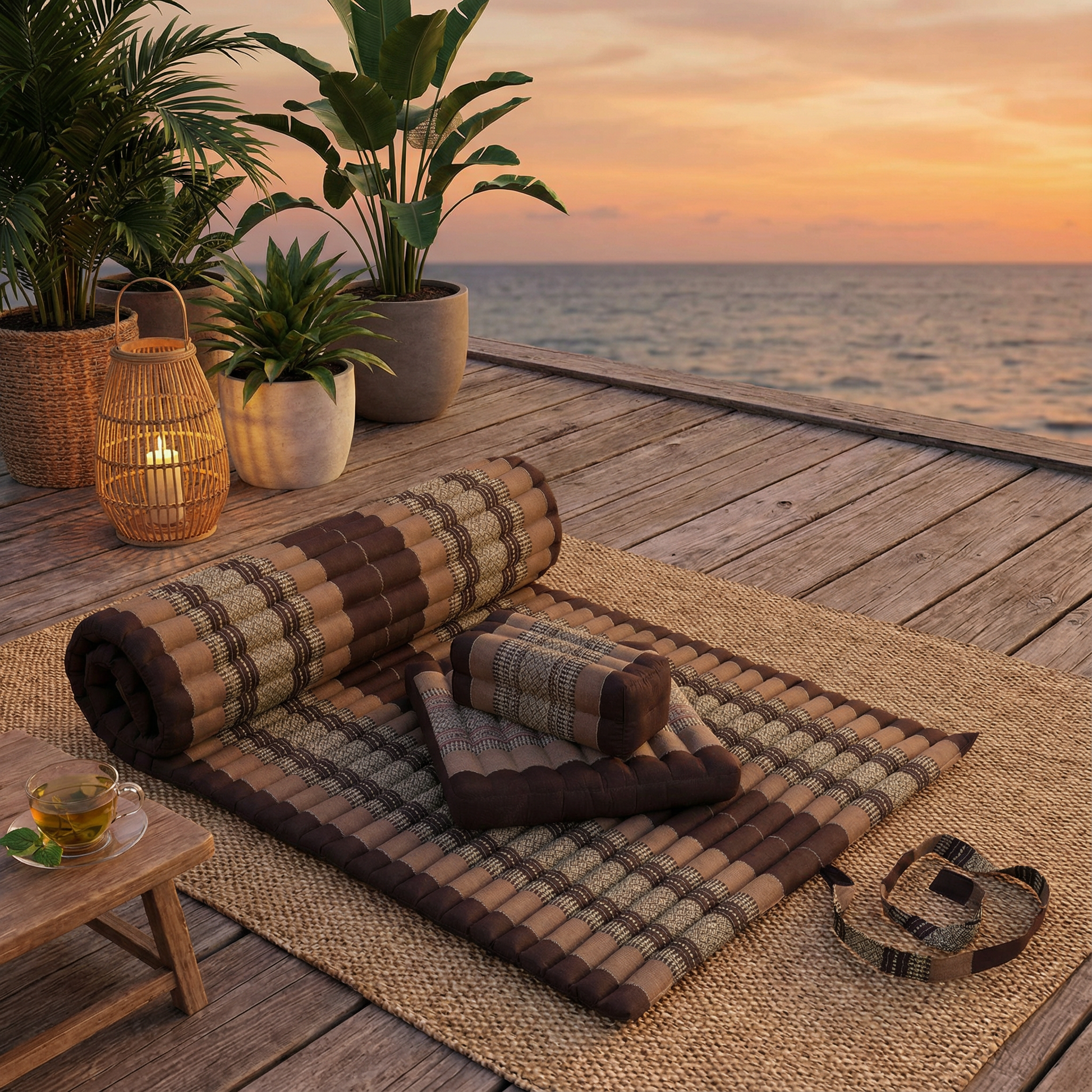 Thaimatten Set: Rollmatte 200x100 + Kissen 35x15x10 + Sitzkissen 40x40 (Thaimuster braun-beige)