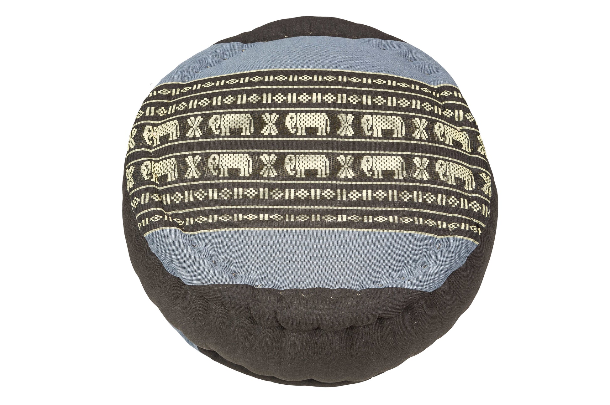 Traditionelles rundes Kissen zur Sitzmeditation mit dekorativen Dehnfalten. Die Kapokfüllung macht das Kissen vergleichsweise leicht, fest und formstabil, außerdem wirkt sie wärme- und feuchtigkeitsausgleichend.